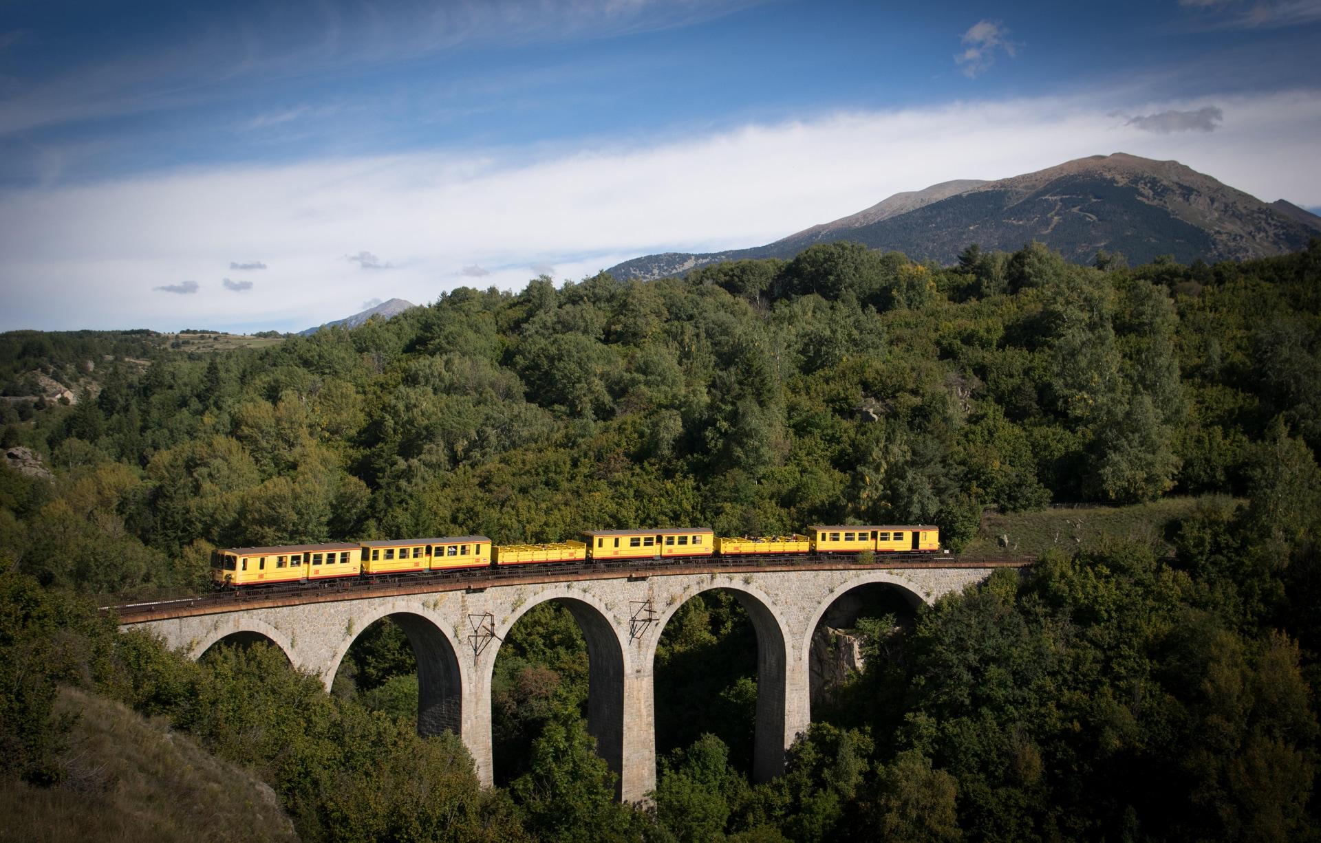 De Kleine Gele Trein slingert op onwaarschijnlijke wijze door kloven, over ravijnen en viaducten op zijn reis door de oostelijke Pyreneeën Credit: © Martin Castellan / Alamy Stock Photo/Martin Castellan / Alamy Stock Photo